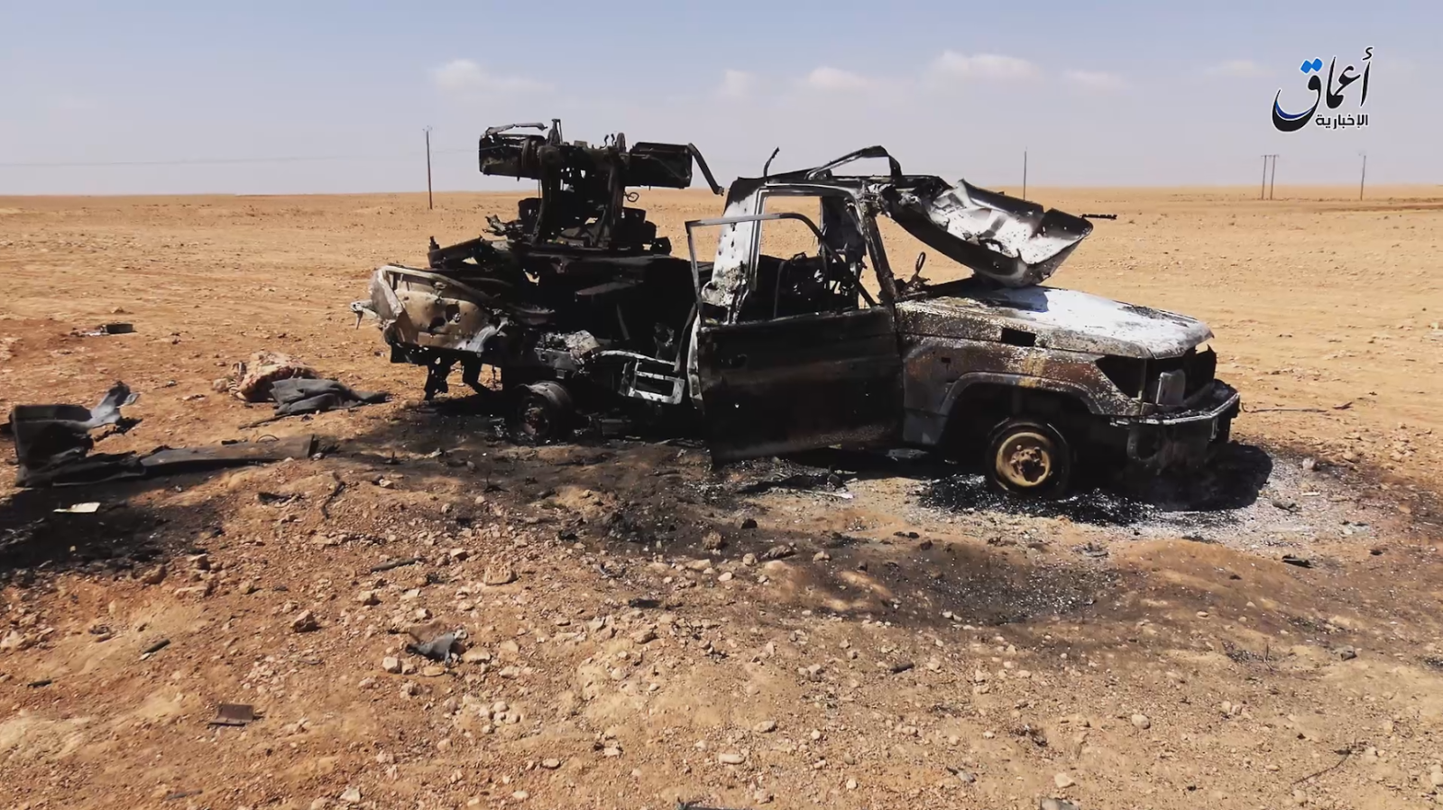 An Islamic State convoy leaving the highway for the SyriaTel towers. Even though they represented easy targets for the Syrian Arab Air Force, the SyAAF was nowhere to be found after initially striking the fighters of the Islamic State when capturing Thawra oilfield and the Safiya crossroads.Several vehicles were destroyed near the SyriaTel towers. Although heavy usage of VBIEDs by the Islamic State was reported during their counter-attack, these were not seen in footage shot by the Amaq News Agency covering the offensive.